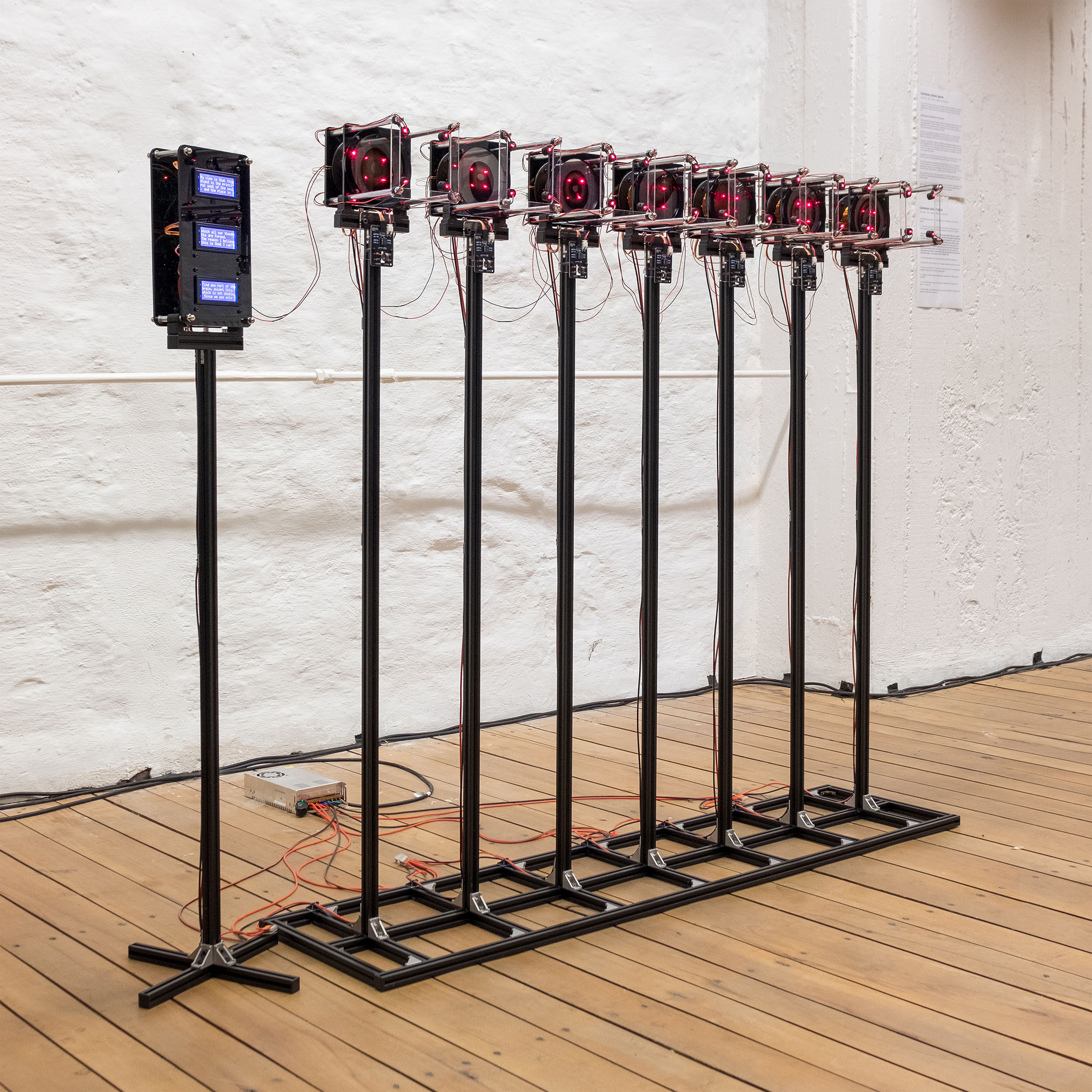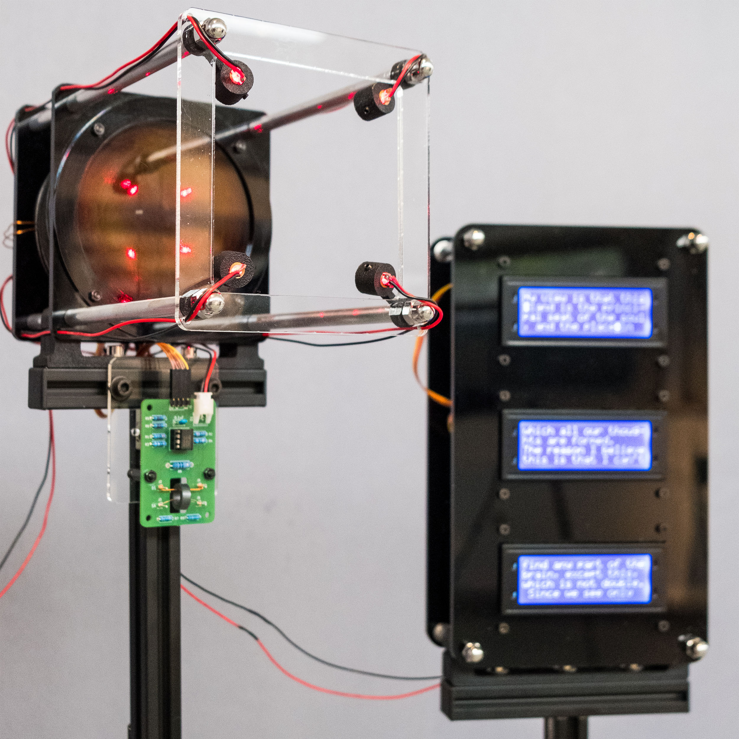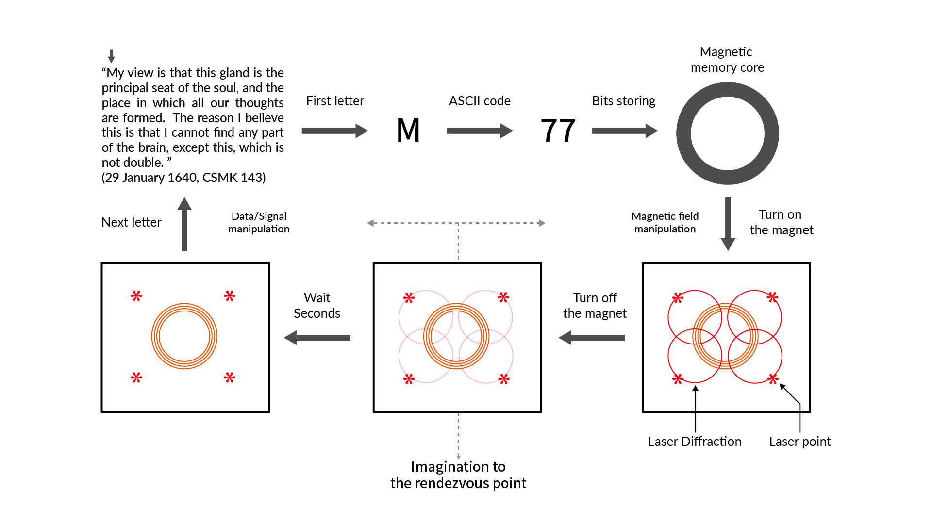 The device transmits a character by a character from texts written by Descartes as an input into the device. The control module converts them to ASCII binary code and sends one bit of data to each memory core. Then generated signals flip the magnetic polarity of memory cores and induce voltage from it. These voltage spikes from the memory core turn on the electronic magnet and magnetic flux around the electromagnet distort laser reflection on the surface.