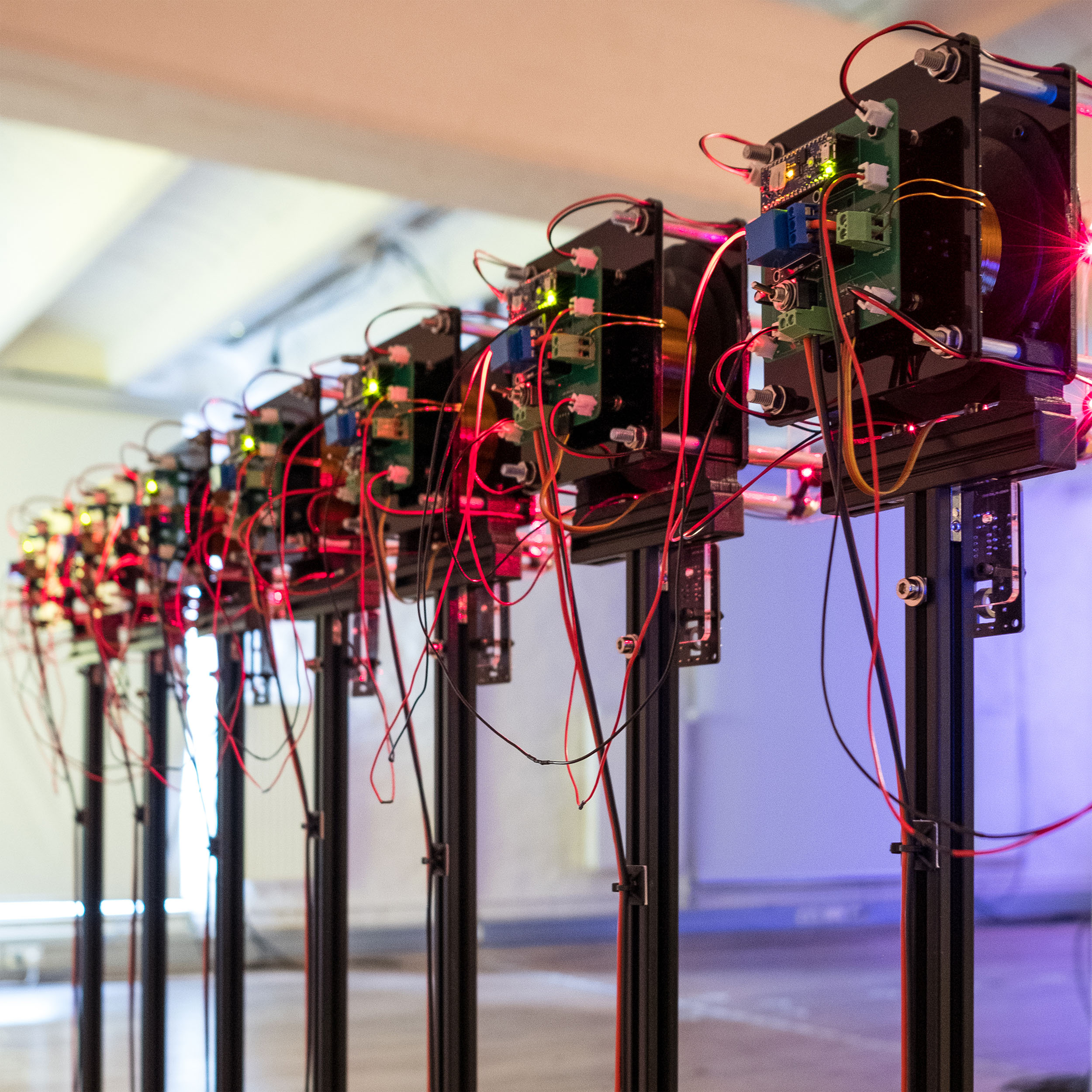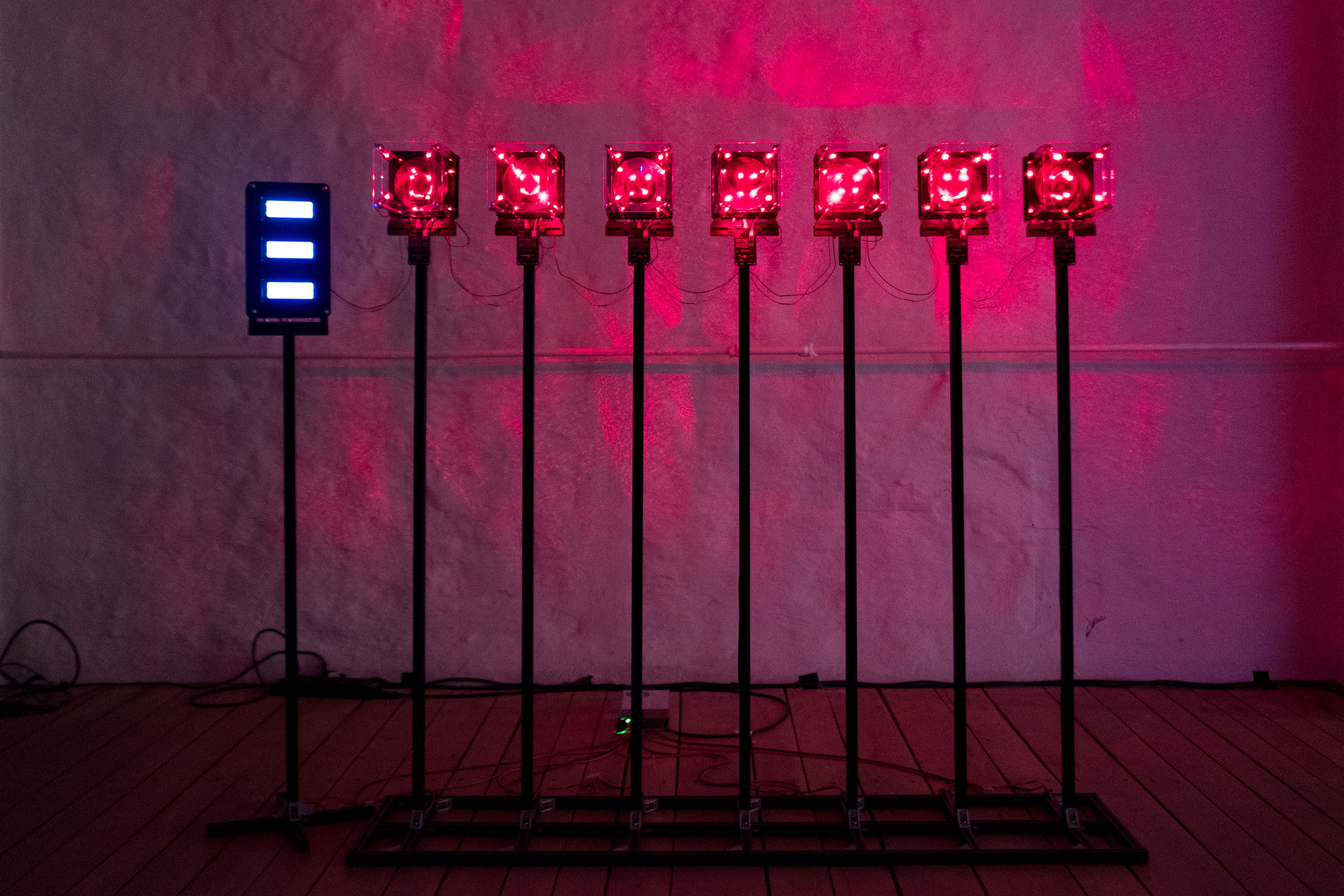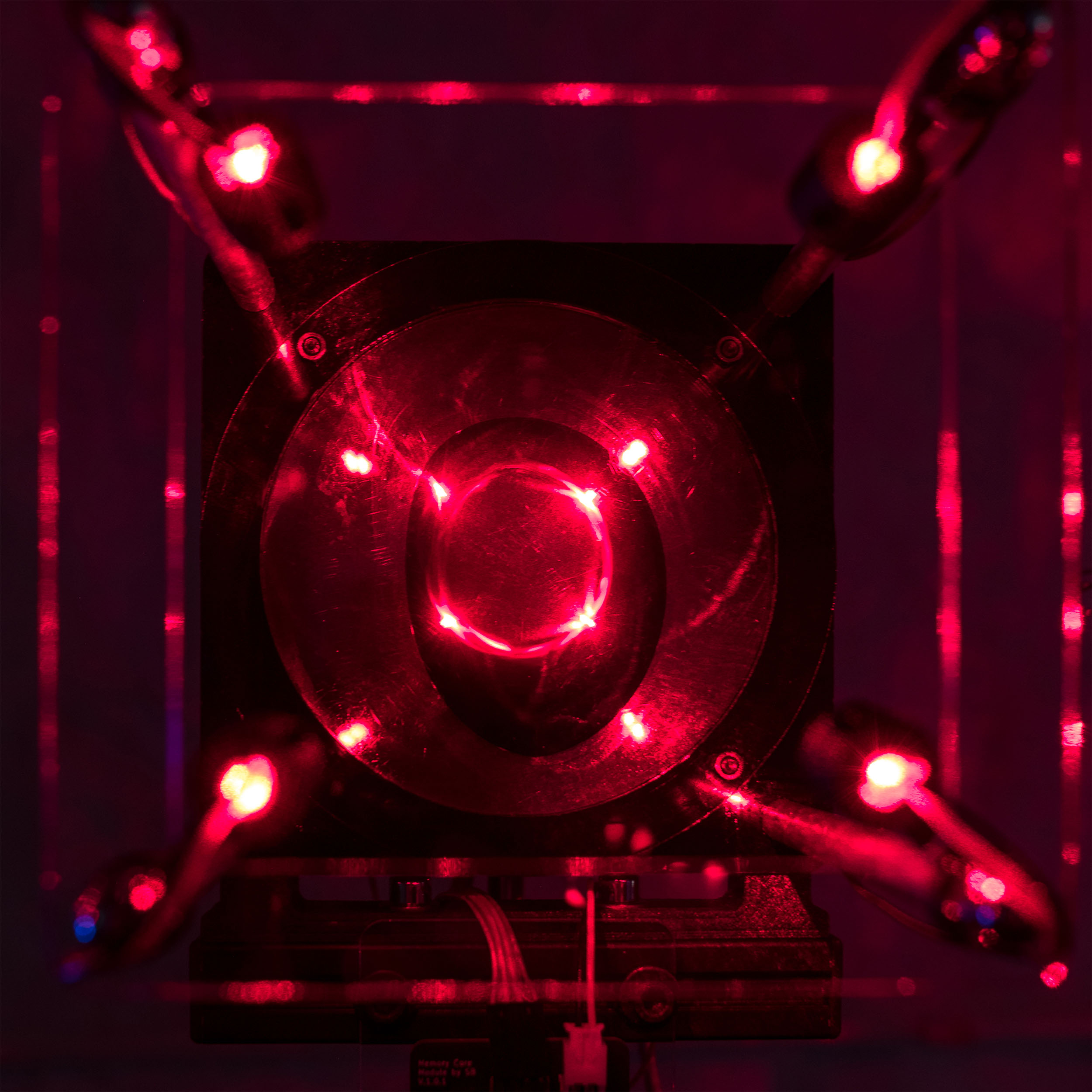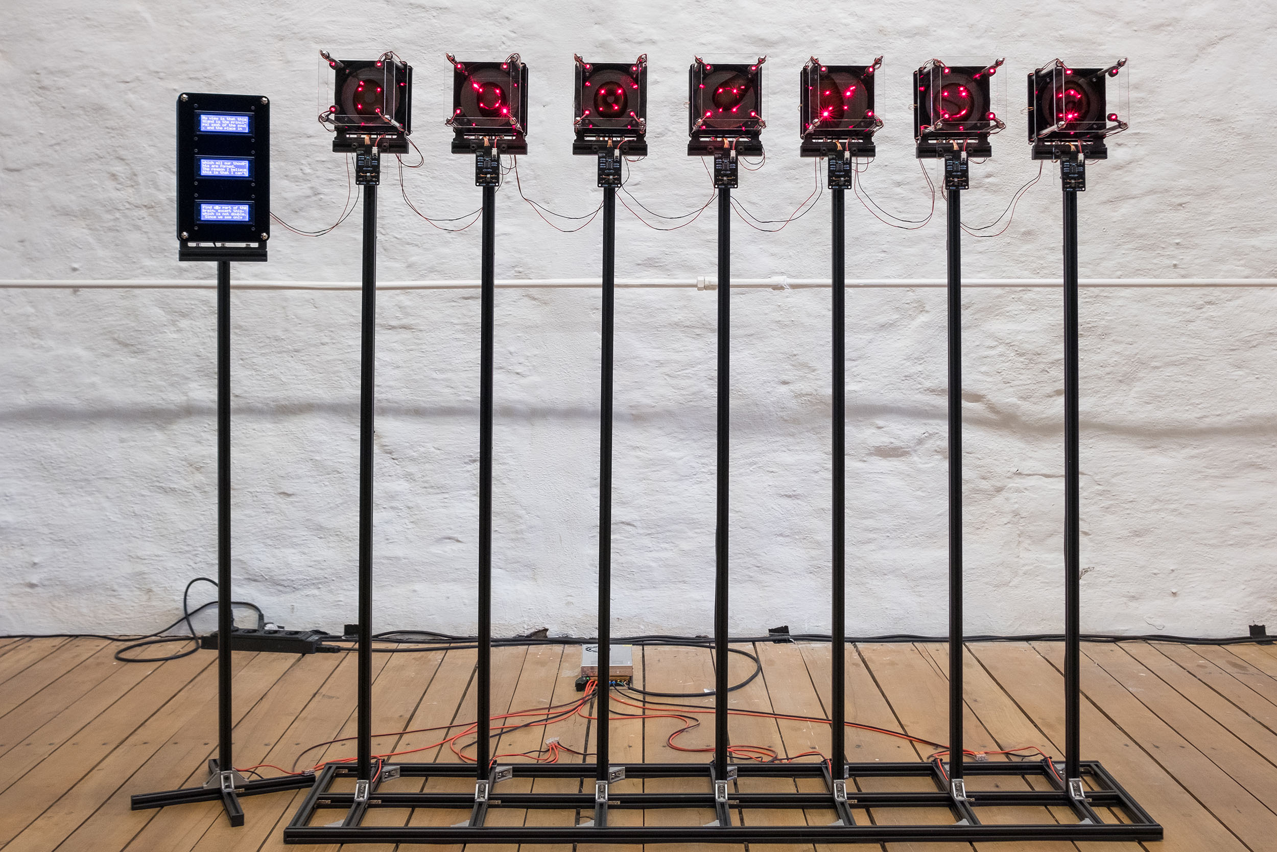 The device transmits a character by a character from texts written by Descartes as an input into the device. The control module converts them to ASCII binary code and sends one bit of data to each memory core. Then generated signals flip the magnetic polarity of memory cores and induce voltage from it. These voltage spikes from the memory core turn on the electronic magnet and magnetic flux around the electromagnet distort laser reflection on the surface.