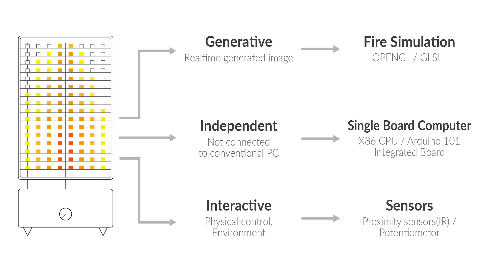 There are similar properties that the LED emits light and the function that the cube can display animation. Therefore, It was concluded that the theme which can effectively use these two is the flame. Just as the flame of the real world, the original form of lighting, is influenced by the surrounding environment, the virtually implemented fireworks can also change the shape and movement through interaction with the user.