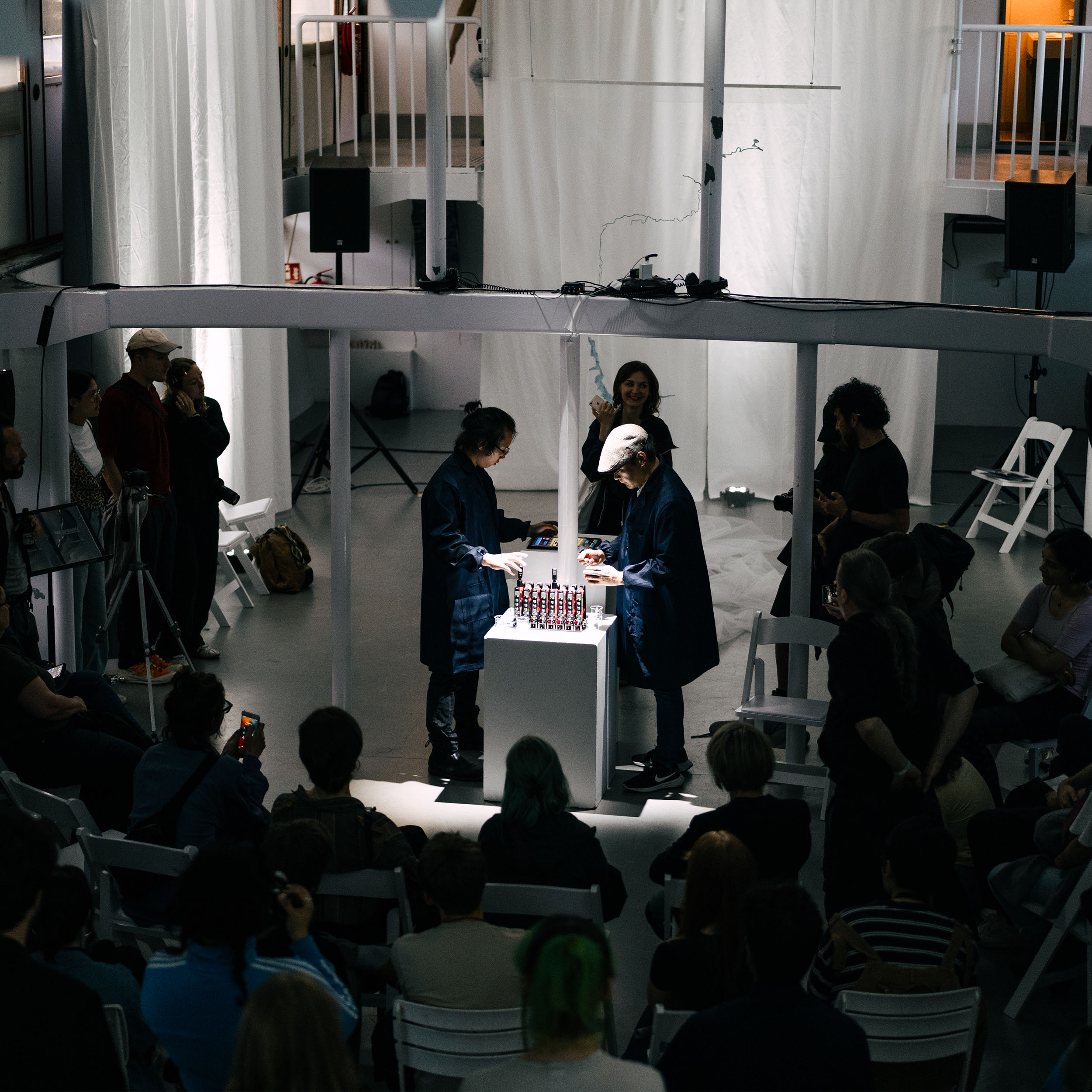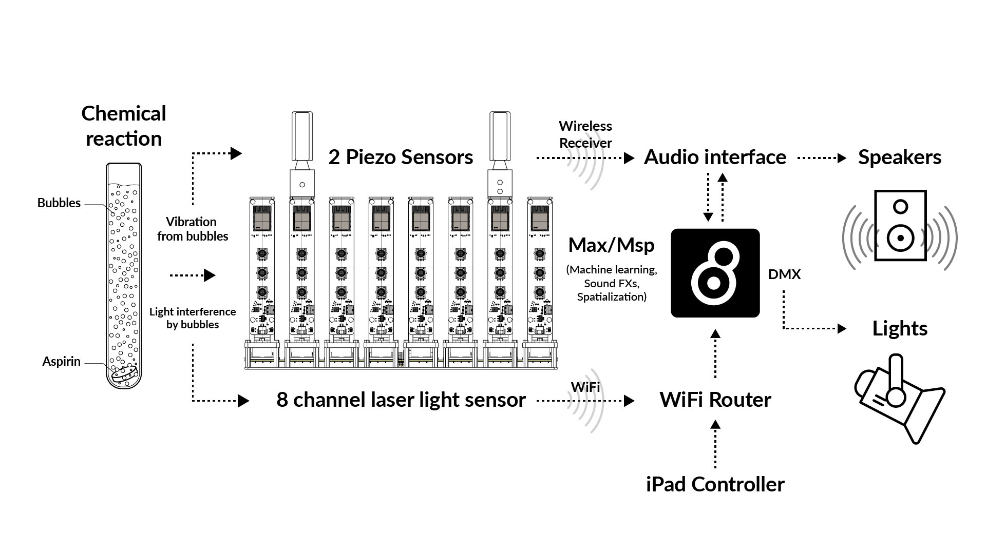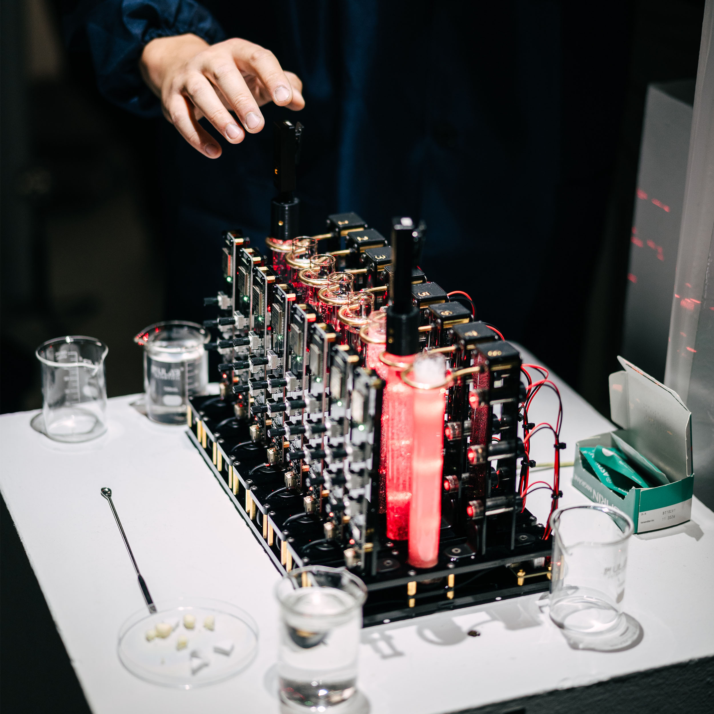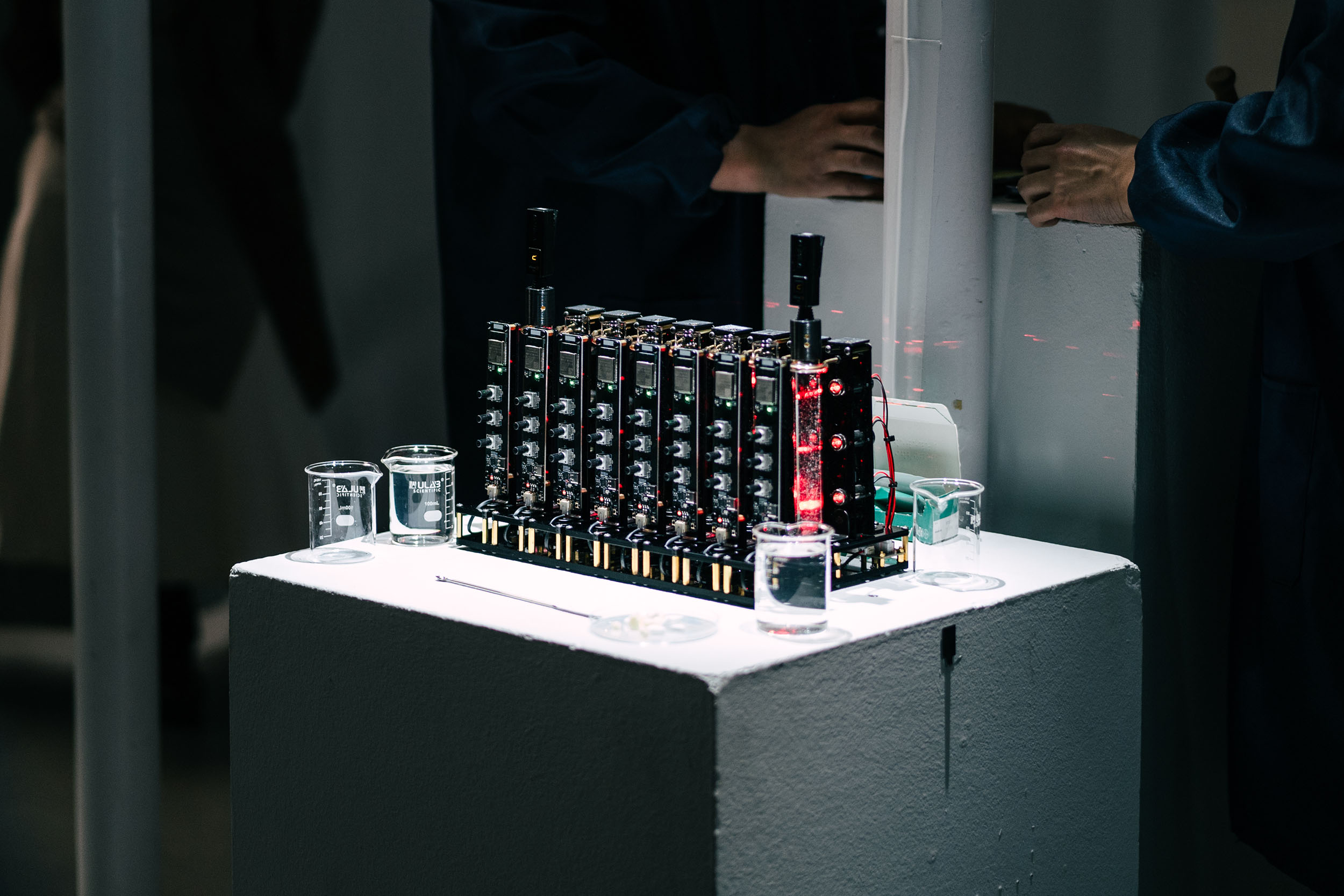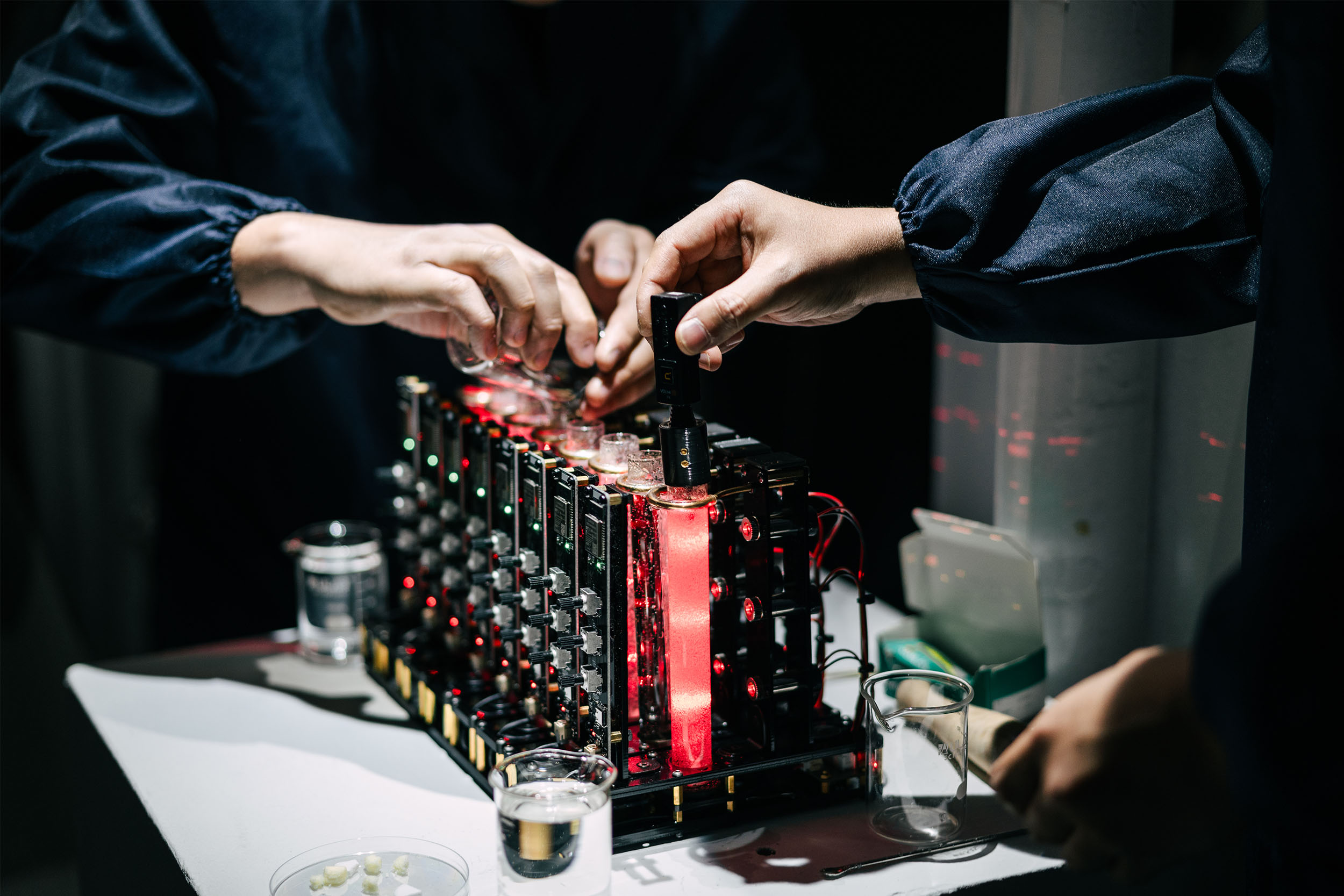 The work is inspired by the attitudes and practices of alchemists in the pre-scientific era. When we first encounter matter in its true form, without the proper analytical tools, what we feel is chaos or even noise. Just as alchemists of the past interpreted the chaotic and mysterious changes of matter in the realm of subjective experience rather than science, this work reinterprets the chemical reactions that occur when matter dissolves into a soundscape through the phenomena of light and vibration.