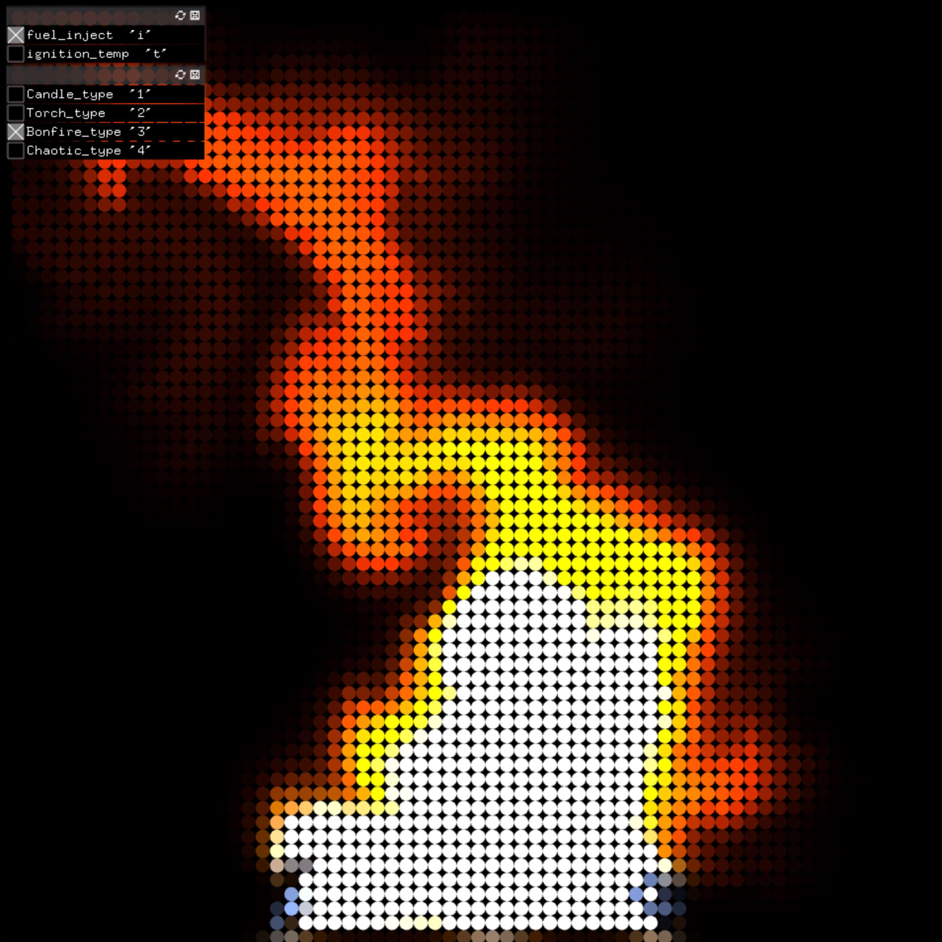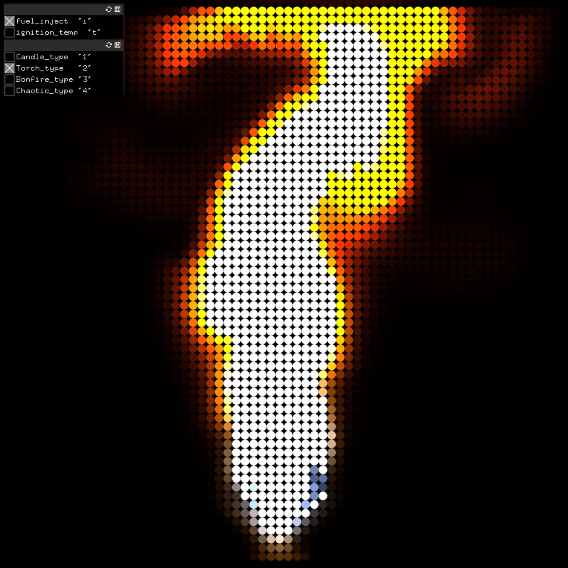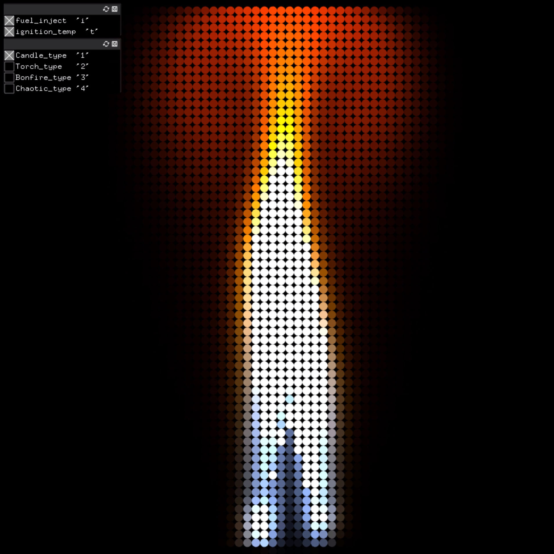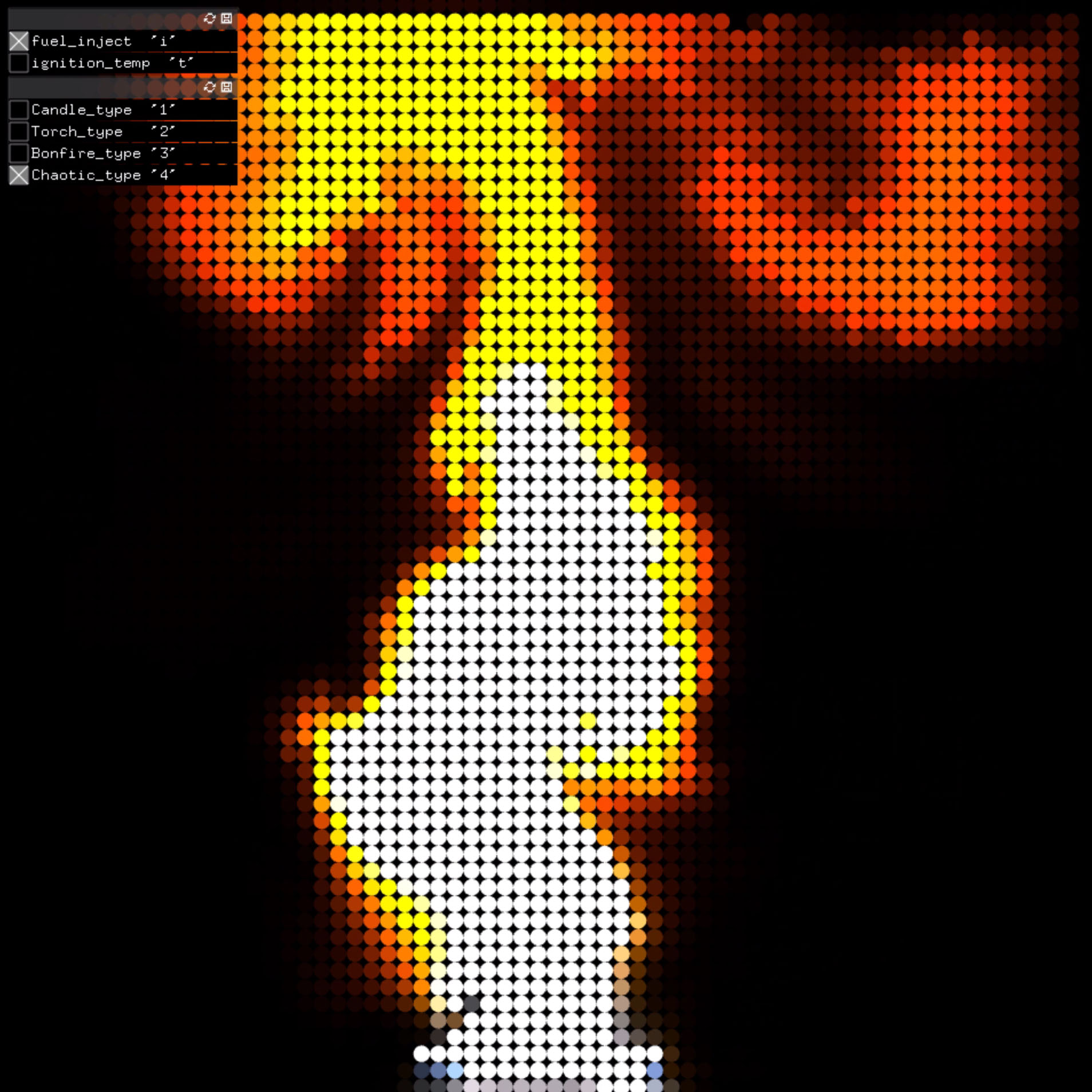 By adding functions to the existing simulator, the color change of the flame by black body radiation was implemented to effectively display the fire on the screen. In addition to the setting of the fuel zone and ignition point, the characteristics of the flame animation can be changed by adjusting certain constant values when creating a flame. A total of four types of flames were created: candle, torch, bonfire, and chaos.